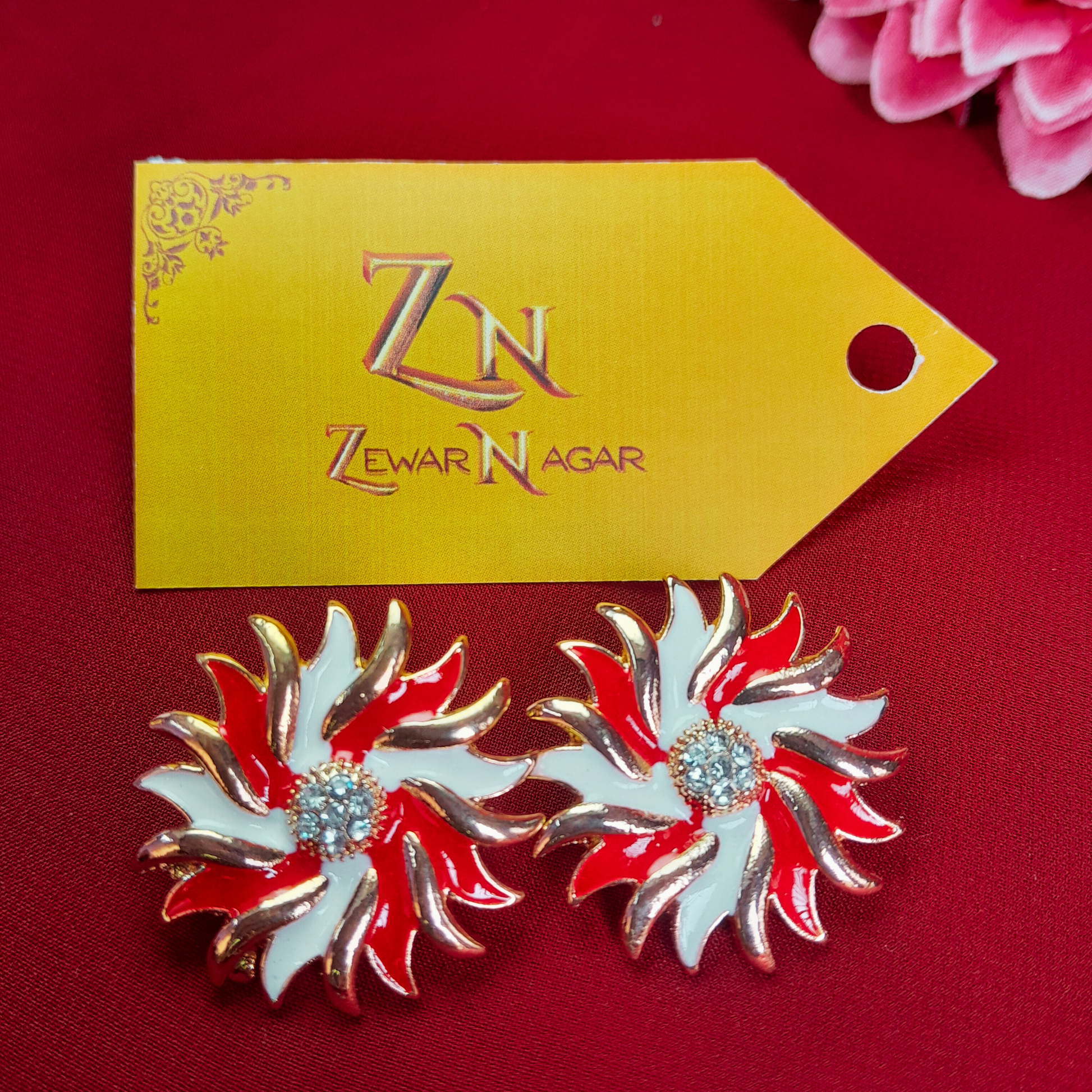 "These stunning flower-shaped earrings feature delicate petals in white, pink, red, and multicolor. A diamond-like stone at the center adds a touch of elegance. From the 'Zewar Nagar' collection."